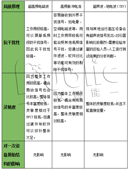 目前局部放电监测设备主要以高频脉冲电流、超高频电磁波、超声波、地电波(TEV)等方式为主;高频脉冲电流原理多用在电缆局放在线监测、开关柜局放在线监测设备、变压器局放在线监测设备、GIS局放监测设备上;超高频原理多用在开关柜局部放电监测设备与GIS局放监测设备,超声波及地电波(TEV)多用于便携式局放检测仪器,现在一些公司开关柜局放在线监测产品也会用到超声波跟地电波(TEV)。不同局放传感器所对应的性能不一样,详见下表。