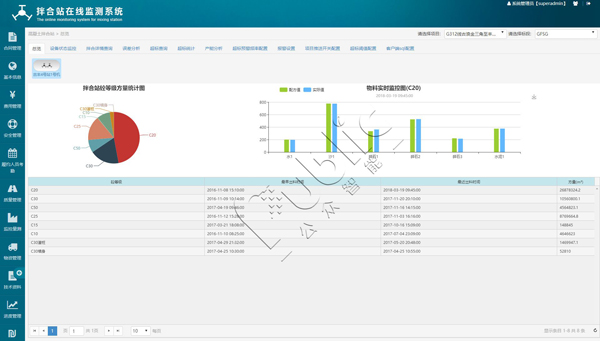 拌合站在公路建设中扮演着至关重要的角色,成品料质量的优劣直接关系到公路建设的品质。拌合站管理系统为业主、监理单位、施工单位等提供了统一的监控管理平台,在施工过程中严格依据配合比,把控公路建设质量。根据拌料的不同,分别推出混凝土拌合站管理系统、沥青拌合站管理系统、改性沥青拌合站管理系统、水稳拌合站管理系统。该系统是集实时监控、超标预警、超标处理、数据分析统计及图表直观展示于一体的综合在线监测管理平台,主要包括系统功能展示及汇总和各个系统适配器部分。展示部分为WEB形式,可对各适配器上传的数据进行实时汇总,以图形及表格形式展示,并可设置相应条件进行查询;适配器为客户端形式,用于从各厂家拌合站系统中采集数据进行上传。