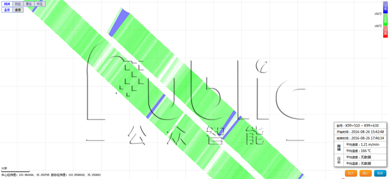 路面施工质量摊铺压实监测系统是利用高精度卫星定位技术实现数字化施工管控,实时监测施工作业面的施工质量数据,以图形化方式展示摊铺机轨迹、摊铺速度、摊铺温度和压路机运行轨迹、压实遍数、压实温度等数据,具备现场数据实时分析、实时纠偏的功能。系统可针对碾压欠压区进行统计,及时报警确保施工质量达标。符合工程施工过程可视化、质量可分析、责任可追溯的管理理念。