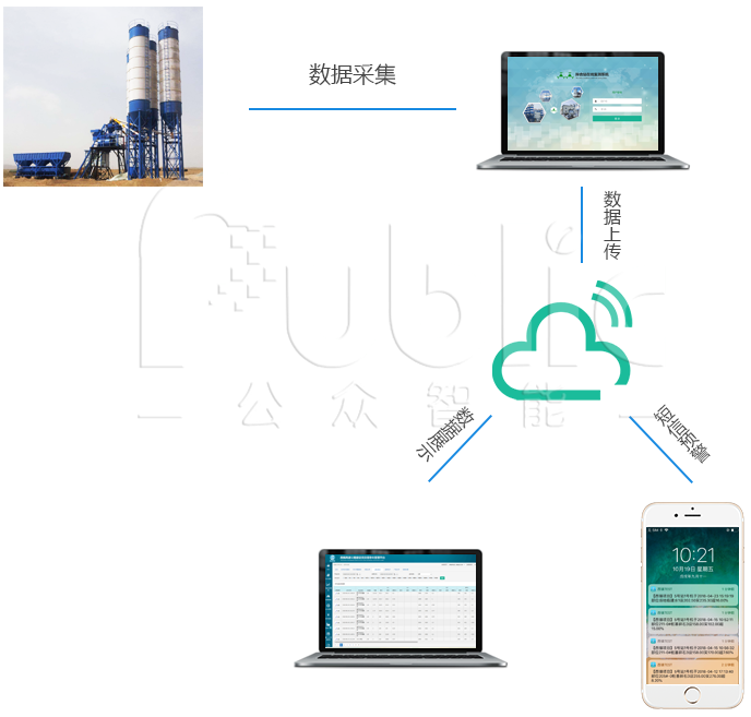 拌合站全过程动态监控系统是我们交通施工信息化综合平台的一个子系统,通过拌合站控制电脑上的安装数据采集工具,将拌合站生产数据进行实时采集,系统对数据进行统计、分析和预警,将相关数据推送到手机APP或通过短信发送至相关人员,也可以通过浏览器在PC端对产量数据、材料用量、拌合时间、超标情况等进行查询。