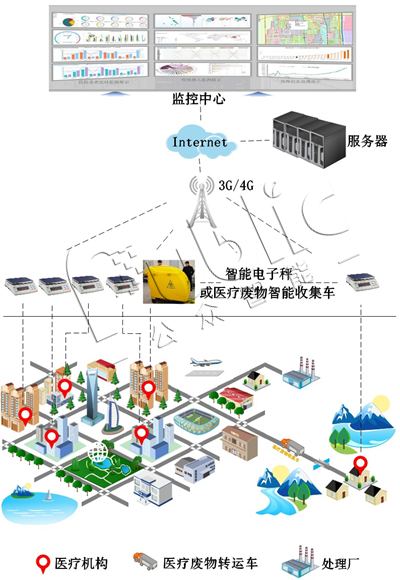 本系统采用BS架构,主要由三部分组成:(1)医废在线监测硬件设备;(2)医疗废物在线监控和管理软件;(3)监控中心。