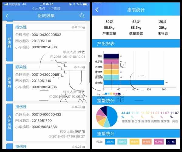 卫监部门与医疗机构可通过此APP,掌握医疗废物实时处置情况(视频监控,医疗废物收集入库数据、收集车轨迹等),监控处置过程的异常情况(接收推送、查看、处置异常报警),查看相关统计分析内容,还可扫描医疗废物条码追溯处置过程信息。