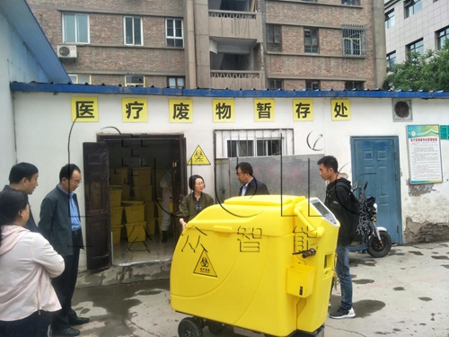 调研过程中,领导观摩医疗废弃物信息化监管的闭环流程中的每一个步骤,即收集人员通过医废智能收集车使用无线扫码枪称重、分类、交接,完成对医疗废物收集数据的实时把控,对于医废收集过程中出现的遗失、超时、破损等状况及时预警,预警后问题及时处理的细节。